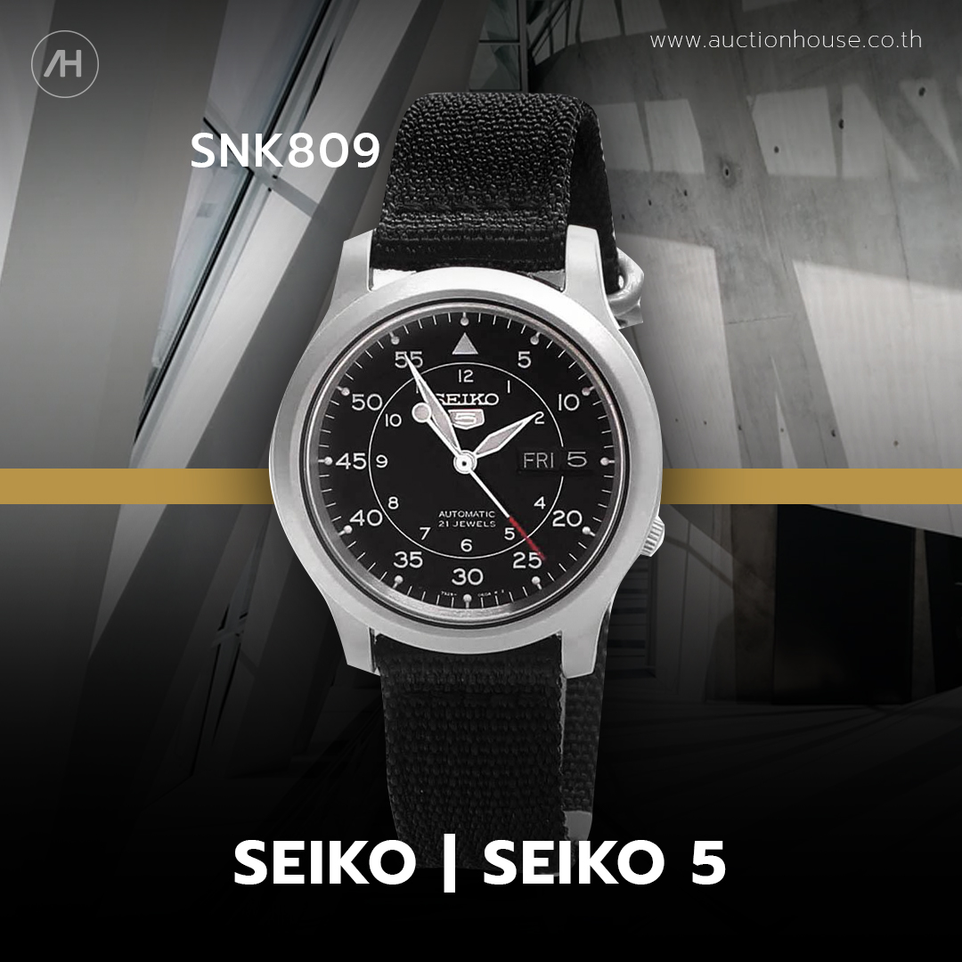 SEIKO 5 คือซีรีย์แห่งความคุ้มค่า เปิดตัวในปี 1963 ด้วยแนวคิดนวัตกรรมหลัก 5 อย่างคือ 1. มีหน้าต่างบอกวันที่ ซึ่งเป็นเรื่องแปลกตาในสมัยนั้น 2. มี In-house Automatic Movement พร้อมกับระบบป้องกันการสั่นสะเทือน ที่เรียกว่า Diashock ซึ่งเทียบชั้นระบบกันสั่น Swiss Incabloc System ได้ 3. ทุกรุ่นสามารถกันน้ำได้ 4. มี Mainspring รุ่น Diaflex ที่ทนทานพร้อมกับเคสที่แข็งแรง 5. มีเม็ดมะยมที่ถอยลงมาอยู่ที่ตำแหน่ง 4 นาฬิกาที่ไม่เหมือนใคร ซึ่ง 5 นวัตกรรมทั้งหมดนี้คือที่มาของชื่อ “SEIKO 5” เนื่องจาก SEIKO 5 มีหลายรุ่นย่อยมากวันนี้เราจะขอแนะนำรุ่น SNK809 ซึ่งเป็นรุ่นที่คุ้มค่าตัวที่สุด ตัวเรือนใช้เคส Stainless Steel ขนาด 37 มิลลิเมตร ผิวด้านหน้าและด้านข้างเป็นแบบด้านและด้านหลังเป็นแบบขัดเงา มีหน้าปัดขนาดเล็ก กระจกเป็นคริสตัล Hardlex ที่ SEIKO ออกแบบเองจึงมีความทนทานกว่ากระจกทั่วไป กันน้ำลึกได้ถึง 30 เมตร จุดเด่นคือด้านหลังเปลือยเพื่อให้ผู้สวมใส่รับชม In-house Automatic Movement ได้อย่างชัดเจน ซึ่งทั้งหมดนี้มีราคาอยู่ในช่วง 2,500 บาทเท่านั้น!