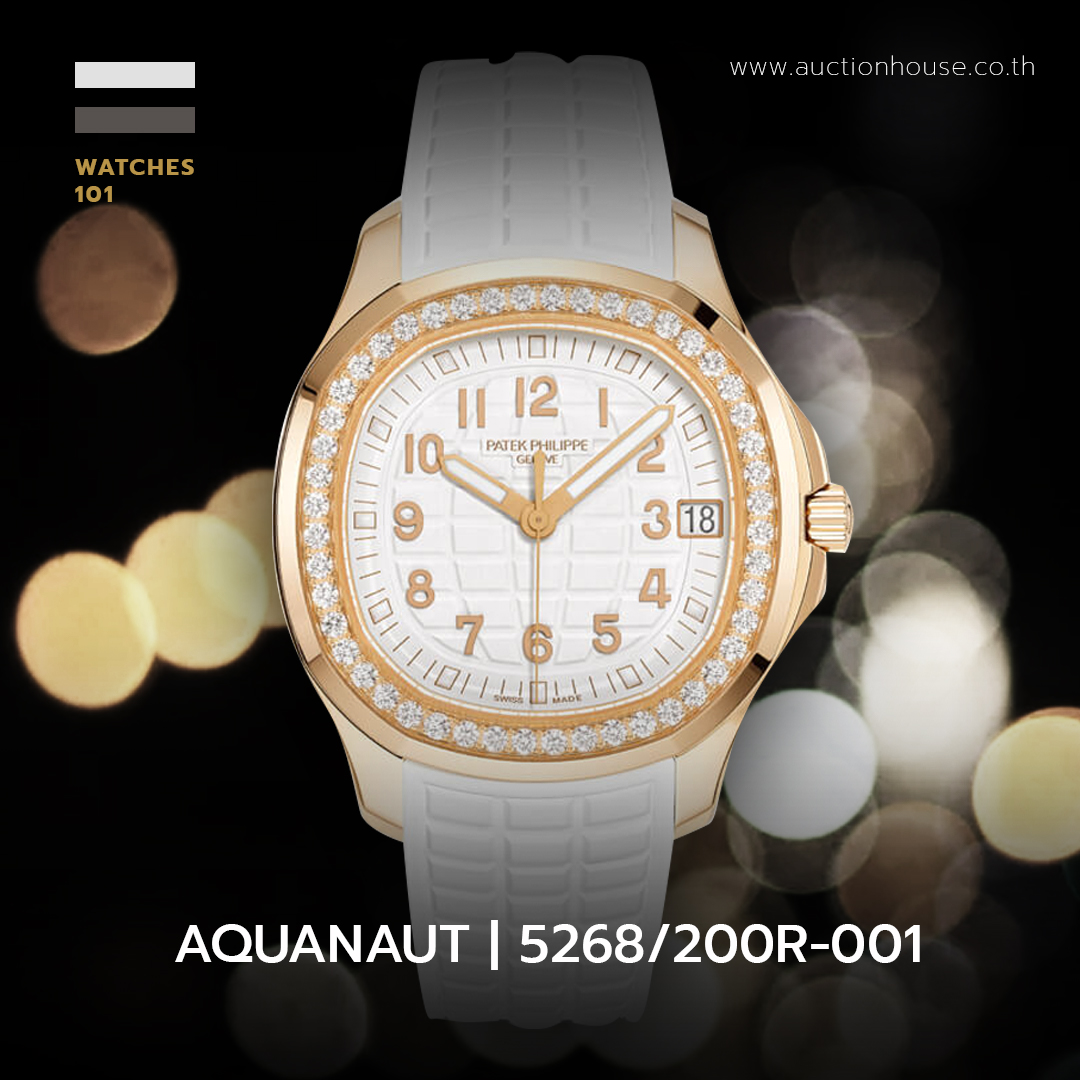 Aquanaut 5268/200R-001 มาพร้อมตัวเรือน Rose Gold และความหนาที่มากขึ้น นาฬิการุ่นนี้มีฟังก์ชันวันที่บริเวณ 3 นาฬิกา มีเพียงเข็มชั่วโมง นาที และวินาทีในการบอกเวลา ขับเคลื่อนด้วยกลไขอัตโนมัติ Cal.26-330 S C ซึ่งแตกต่างจาก Ref. 5269/200R-001 ที่ใช้กลไกควอตซ์ ตัวเรือนผลิตจาก Rose Gold ขนาด 38.8 มิลลิเมตร หนา 8.5 มิลลิเมตร หน้าปัดสีขาวคงความเป็นเอกลักษณ์ด้วยลวดลาย Chocolate ตกแต่งขอบหน้าปัดด้วยการประดับเพชร 48 เม็ด หลักชั่วโมงตัวเลขอารบิกและชุดเข็มทำจาก Rose Gold ที่เคลือบสารเรืองแสง Super Luminova เพื่อให้สามารถมองเห็นได้ในที่มืด ส่วนด้านหลังตัวเรือนแบบเปลือยให้เห็นการทำงานของกลไก ใช้กระจกแซฟไฟร์เพื่อป้องกันรอยขีดข่วน สำรองพลังงานได้สูงสุด 45 ชั่วโมง และกันน้ำลึก 120 เมตร ราคา 1,533,200 บาท