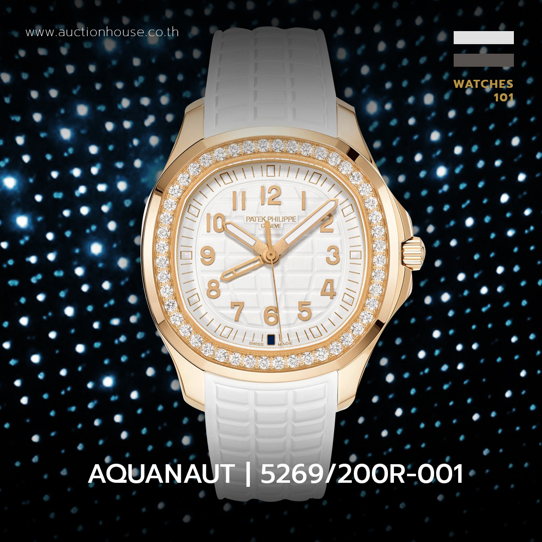 ปิดท้ายด้วย Aquanaut 5269/200R-001 โดดเด่นด้วยกลไกตัวล่าสุดจาก Patek Philippe ที่มาพร้อมฟังก์ชัน Travel Time Aquanaut Luce Quartz Travel Watch อยู่ในคอลเลกชัน Aquanaut Luce ที่มาพร้อมกับกลไกควอตซ์ Calibre E 23-250 S FUS 24H ตัวใหม่ล่าสุดจากแบรนด์ Patek Philippe มาพร้อมกับฟังก์ชัน Travel Time ที่จะแสดงเวลาแบบ 2 ไทม์โซน มีช่องหน้าต่างบริเวณ 6 นาฬิกาเพื่อบอกกลางวันหรือกลางคืน ซึ่งปรับตั้งเข็มทุกชุดได้ด้วยเม็ดมะยมเพียงเม็ดเดียว ตัวเรือนผลิตจาก Rose Gold ขนาด 38.8 มิลลิเมตร พร้อมหน้าปัดสีขาวลวดลาย Chocolate อันเป็นเอกลักษณ์ของ Aquanaut ขอบหน้าปัดสีทองประดับด้วยเพชร 48 เม็ด มองดูสวยงามและหรูหรา จับคู่กับสายนาฬิกาสีขาวที่เข้ากับตัวเรือนได้เป็นอย่างดี ส่วนด้านหลังตัวเรือนเป็นแบบปิดทึบและสามารถกันน้ำลึกได้ 60 เมตร ราคาหน้าเว็บ 1,235,300 บาท