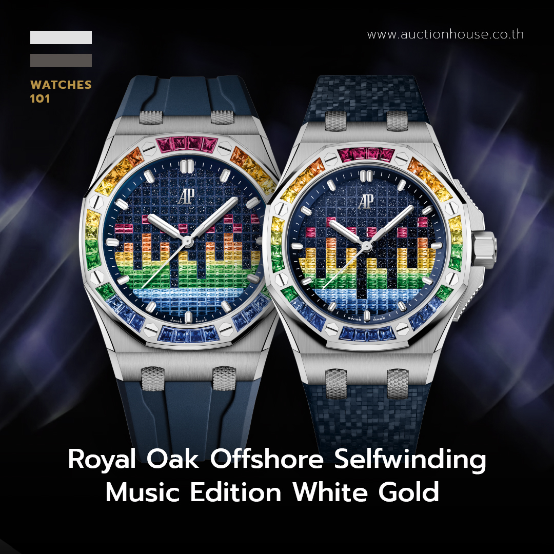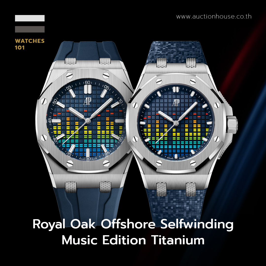 เริ่มต้นด้วยตัวเรือนวัสดุไทเทเนียม โดดเด่นด้วยหน้าปัดสีน้ำเงินลายทาพิสเซอรี (Tapisserie) สี่เหลี่ยมนูน ประดับชุดเข็มและหลักชั่วโมงไวท์โกลด์ 18k ที่เคลือบสารเรืองแสงเพื่อให้สามารถอ่านเวลาในที่มืดได้อย่างชัดเจน มีการสลักลายบริเวณด้านข้างฝั่งขวาของตัวเรือนต่อจากที่ครอบปกป้องเม็ดมะยม ซึ่งได้แรงบันดาลใจมาจากคันปรับตั้งของเครื่องมิกซ์เสียง มาพร้อมตัวเรือนไทเทเนียม ที่มีให้เลือก 2 ขนาด คือ 37 มิลลิเมตร จับคู่กับสายยางสีน้ำเงินตกแต่งลายโมเสก และขนาด 43 มิลลิเมตร จับคู่มากับสายยางสีน้ำเงินที่เข้ากับสีของหน้าปัดได้เป็นอย่างดี ส่วนด้านหลังตัวเรือนใช้วัสดุไทเทเนียมเผยให้เห็นการทำงานของกลไกไขลานอัตโนมัติ Calibre 4309 ซึ่งสำหรับรุ่นขนาด 37 มิลลิเมตร จะสามารถสำรองพลังงานได้นานถึง 60 ชั่วโมง มีราคาอยู่ที่ประมาณ 980,000 บาท และรุ่นขนาด 43 มิลลิเมตร จะสามารถสำรองพลังงานได้นาน 70 ชั่วโมง ในราคา 1,070,000 บาท โดยนาฬิการุ่นนี้ถูกผลิตในจำนวนจำกัดเพียง 500 เรือนเท่านั้น สะท้อนให้เห็นถึงความเป็นเอกลักษณ์ของ Audemars Piguet ที่ผสานเข้ากับดนตรีได้อย่างลงตัวและสวยงาม