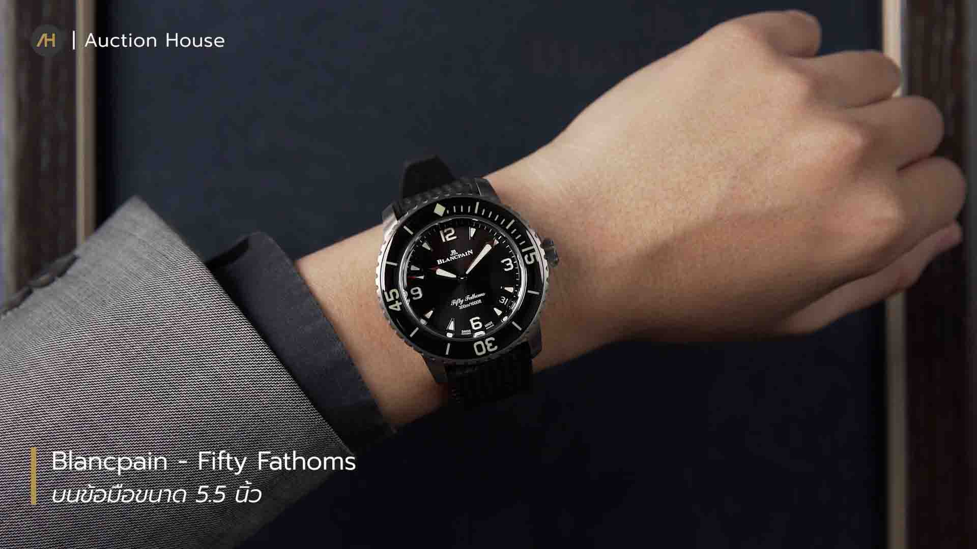 โดยหากเทียบ Fifty Fathoms ที่อยู่บนข้อมือเล็กขนาด 5.5 นิ้ว ก็ถือว่าพอดี ไม่ใหญ่เทอะทะเกินไป