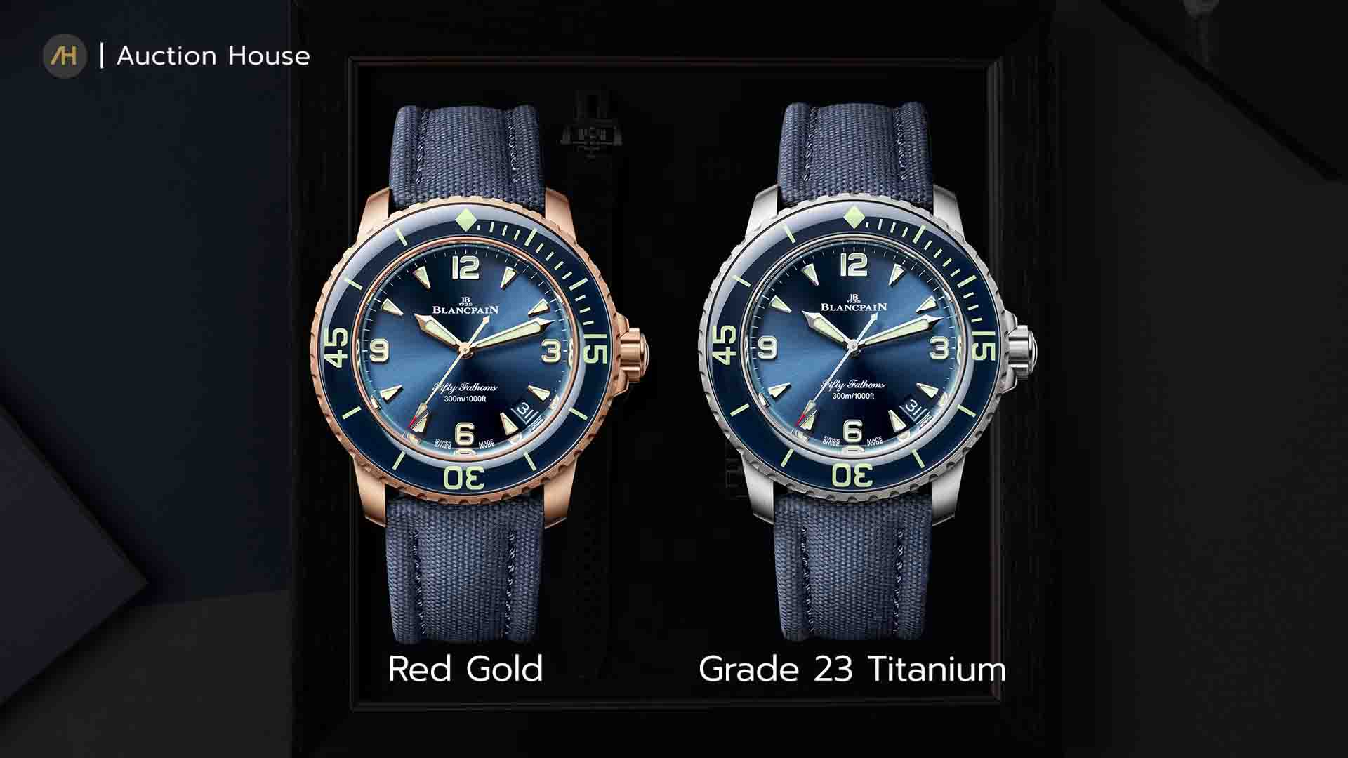ในขณะที่ Fifty Fathoms ใช้วัสดุไทเทเนียมเกรด 23 ที่ถูกขัดแต่งแบบซาตินทั้งเรือน ทำให้ทั้งคู่ดูเป็นนาฬิกาสปอร์ตหรูที่มีรากฐานความเป็น Tool Watch ได้เป็นอย่างดี