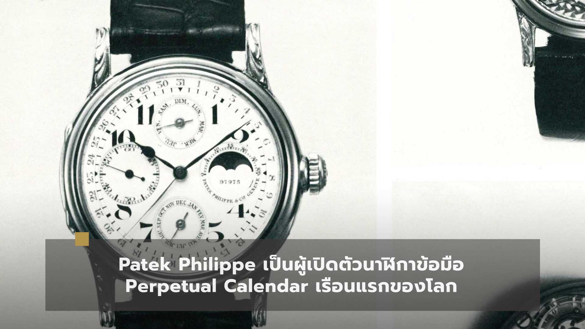 โดยนาฬิกาข้อมือที่มีฟังก์ชันปฏิทินถาวรเรือนแรกของโลก เปิดตัวครั้งแรกในปี 1925 ในชื่อ Patek Philippe Ref. 97975 มีการแกะสลักตัวเรือนทอง 18K ด้วยมือทั้งหมด โดดเด่นด้วยการแสดงวันที่ผ่านเข็มไปยังสเกลรอบขอบหน้าปัด ซึ่งจะแตกต่างจากการแสดงผ่านช่องหน้าต่างตามปกติในสมัยก่อน ในขณะที่เดือนจะปรากฏบนหน้าปัดย่อยบริเวณ 6 นาฬิกา ส่วนการแสดงวันของสัปดาห์จะอยู่ตรงหน้าปัดย่อยบริเวณ 12 นาฬิกา