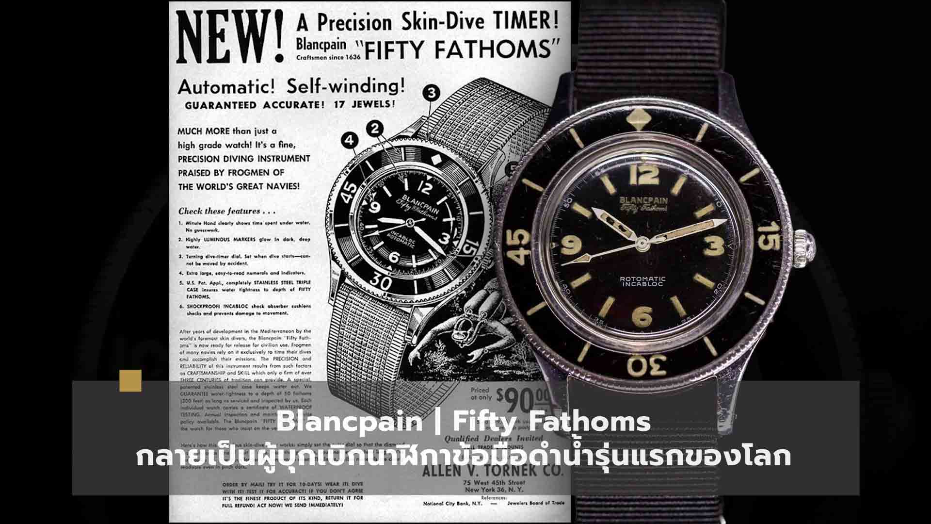 ในช่วงปี 1950 เป็นยุคแรกของการดำน้ำลึก อุปกรณ์ในการดำน้ำก็ยังไม่ครบถ้วน ทำให้การดำน้ำลึกเป็นไปได้อย่างยากลำบาก ซึ่ง Jean-Jacques Fiechter ผู้บริหารแบรนด์ Blancpain ผู้ซึ่งหลงใหลในการดำน้ำ ได้ไปดำน้ำในทะเลทางตอนใต้ของฝรั่งเศส ในขณะที่ดำน้ำอยู่นั้นเขาจำไม่ได้ว่าอยู่ใต้น้ำมานานเท่าไรแล้ว ออกซิเจนที่มีก็ค่อย ๆ หมดลง เขาจึงต้องขึ้นสู่ผิวน้ำอย่างกระทันหันซึ่งเป็นวิธีที่ไม่ปลอดภัยเลย จากสถานการณ์นี้ทำให้เขาฉุกคิดขึ้นได้ว่า สิ่งที่นักดำน้ำต้องมีไม่ใช่แค่ถังออกซิเจนหรือตีนกบ แต่ยังต้องการอุปกรณ์ที่สามารถบอกระยะเวลาในการดำน้ำตั้งแต่เริ่มต้นจนจบได้ด้วย จนในที่สุดทางแบรนด์ก็ได้คิดค้นและผลิตนาฬิกา Blancpain Fifty Fathoms นาฬิกาดำน้ำเรือนแรกของโลก ซึ่งได้ถือกำเนิดขึ้นในปี 1953 ขับเคลื่อนด้วยกลไกไขลานอัตโนมัติ หน้าปัดสีดำ ตัวเลขขนาดใหญ่ และหลักชั่วโมงทรงเรขาคณิตที่มองเห็นได้ชัดเจน ตลอดจนกรอบหน้าปัดหมุนได้ที่ใช้ในการจับเวลา มาพร้อมชุดเข็มขนาดใหญ่เคลือบด้วยสารเรืองแสงที่ส่องสว่างได้ดีในใต้น้ำ ซึ่ง Fifty Fathoms ก็ได้กลายเป็นผู้บุกเบิกนาฬิกาดำน้ำรุ่นแรกและเป็นหนึ่งในรุ่นยอดนิยมของแบรนด์นับตั้งแต่นั้นเป็นต้นมา