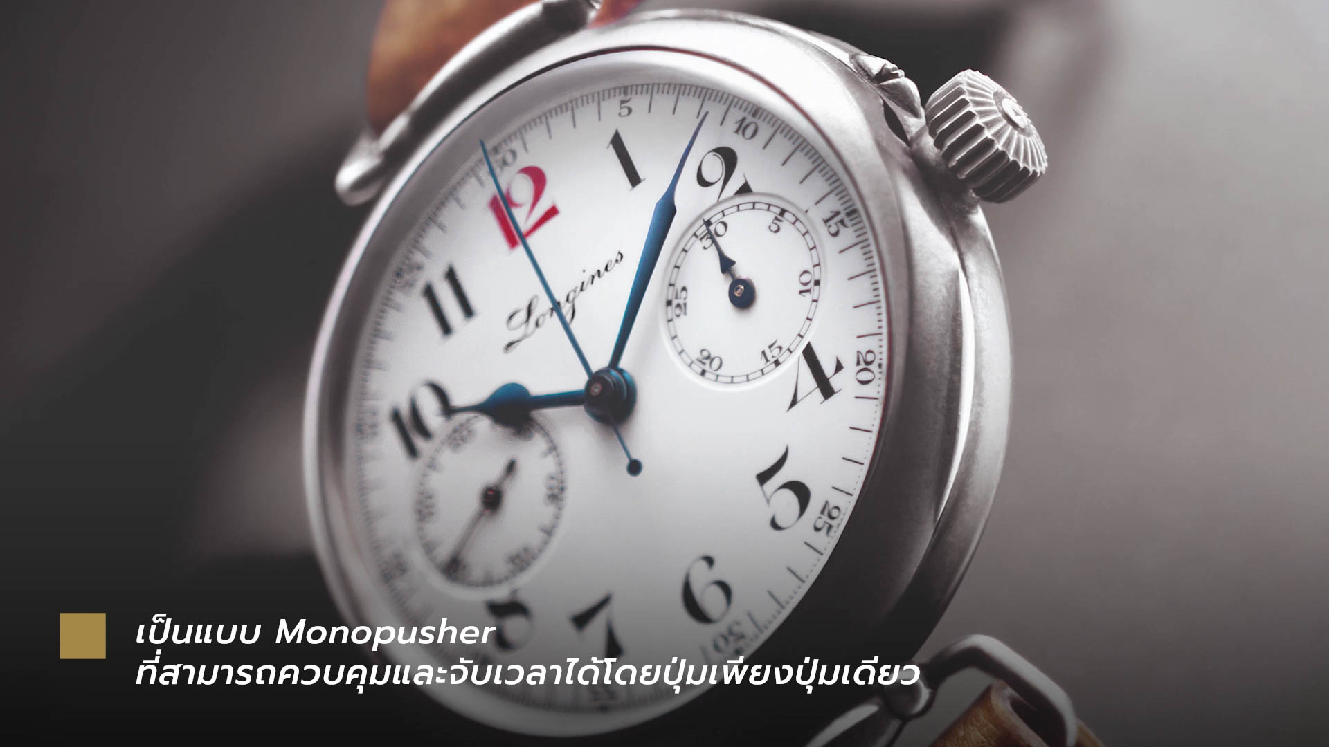 นาฬิกาโครโนกราฟเป็นนาฬิกาที่มีฟังก์ชันการจับเวลาที่แสดงผลโดยใช้เข็มบอกเวลาได้อย่างแม่นยำ ย้อนกลับไปในช่วงแรกเริ่มก็จะพบว่า Longines ได้สร้างนาฬิกาข้อมือโครโนกราฟที่เก่าแก่ที่สุดเรือนหนึ่งในปี 1913 โดยเป็นแบบ Monopusher Chronograph ที่สามารถควบคุมการจับเวลาได้โดยใช้ปุ่มกดเพียงปุ่มเดียว ที่มีความแม่นยำได้ถึง 1/5 วินาที