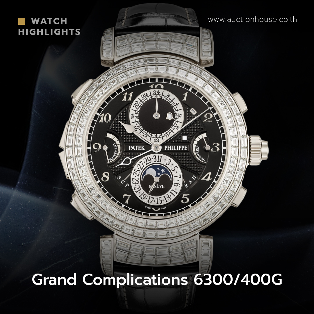 มาเริ่มกันที่ Grand Complications 6300/400G ที่มีความสลับซับซ้อนสูงมากด้วย 20 ฟังก์ชัน โดดเด่นด้วยหน้าปัดสีดำสองหน้าที่พลิกกลับด้านได้ ล้อมรอบด้วยทองคำขาวประดับด้วยเพชรเจียระไนทรงบาแก็ตต์ทั้งหมดจำนวน 409 เม็ด (31.35 กะรัต) โดยบริเวณกรอบและตัวเรือนประดับเพชรเจียระไนทรงเหลี่ยม 387 เม็ด (30.16 กะรัต) ส่วนบริเวณเข็มกลัดมีเพชรอยู่จำนวน 22 เม็ด (1.19 กะรัต) ติดตั้งหลักชั่วโมงที่เป็นตัวเลขสีทองตัดกับสีของหน้าปัดได้เป็นอย่างดี มาพร้อมตัวเรือนไวท์โกลด์ ขนาด 49.4 มิลลิเมตร หนา 16.32 มิลลิเมตร จับคู่มากับสายหนังจระเข้สีดำ ขับเคลื่อนด้วยกลไก Caliber 300 GS AL 36‑750 QIS FUS IRM ที่สามารถสำรองพลังงานได้นาน 72 ชั่วโมง ส่วนราคายังไม่ถูกเปิดเผย