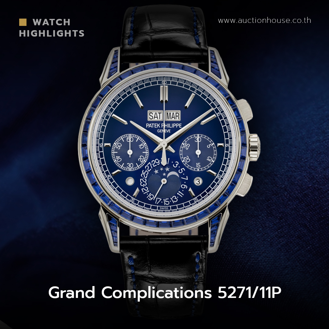 Grand Complications 5271/11P โดดเด่นด้วยหน้าปัดสีน้ำเงิน ตกแต่งขอบหน้าปัดด้วยแซฟไฟร์สีน้ำเงินที่ถูกเจียระไนทรงเหลี่ยม 58 เม็ด (4.11 กะรัต) ที่เข้ากับสีของหน้าปัดได้เป็นอย่างดี พร้อมประดับแซฟไฟร์เจียระไนทรงเหลี่ยม 22 เม็ด (1.05 กะรัต) และแซฟไฟร์เจียระไนทรงเหลี่ยม 22 เม็ด (1.05 กะรัต) อยู่บริเวณเข็มขัด ซึ่งรวมแซฟไฟร์ที่เจียระไนทรงบาแก็ตต์ทั้งหมด 80 เม็ด (5.16 กะรัต) มาพร้อมตัวเรือนแพลทินัม ขนาด 41 มิลลิเมตร หนา 12.7 มิลลิเมตร จับคู่กับสายหนังจระเข้สีดำเงาพร้อมบุด้ายสีน้ำเงินที่ตัดกันได้เป็นอย่างดี ขับเคลื่อนการทำงานด้วยกลไกโครโนกราฟ Caliber CH 29‑535 PS Q ที่สามารถสำรองพลังงานได้นาน 65 ชั่วโมง และกันน้ำลึก 30 เมตร มีราคาอยู่ที่ 11,941,600 บาท