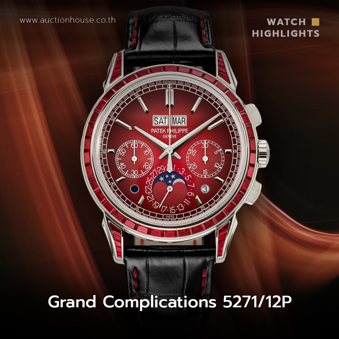 ปิดท้ายด้วย Grand Complications 5271/12P นาฬิกาที่โดดเด่นด้วยหน้าปัดสีแดงประดับอัญมณีสีแดงที่เข้ากับหน้าปัดได้เป็นอย่างดี ประดับด้วยทับทิมเจียระไนทรงเหลี่ยม 58 เม็ด (4.11 กะรัต) บริเวณขอบหน้าปัด รวมถึงบริเวณเข็มขัดก็ประดับทับทิมเหลี่ยมเจียระไน 22 เม็ด (1.14 กะรัต) ซึ่งรวมทับทิมเจียระไนทรงเหลี่ยมทั้งหมดเป็น 80 เม็ด (5.25 กะรัต) มาพร้อมตัวเรือนวัสดุแพลทินัม ขนาด 41 มิลลิเมตร หนา 12.7 มิลลิเมตร จับคู่มากับสายหนังจระเข้สีดำตัดกับด้ายสีแดงได้อย่างสวยงาม ขับเคลื่อนด้วยกลไกโครโนกราฟ Caliber CH 29‑535 PS Q ที่สามารถสำรองพลังงานได้นาน 65 ชั่วโมง และกันน้ำลึก 30 เมตร มีราคาค่าตัวอยู่ที่ 11,941,600 บาท