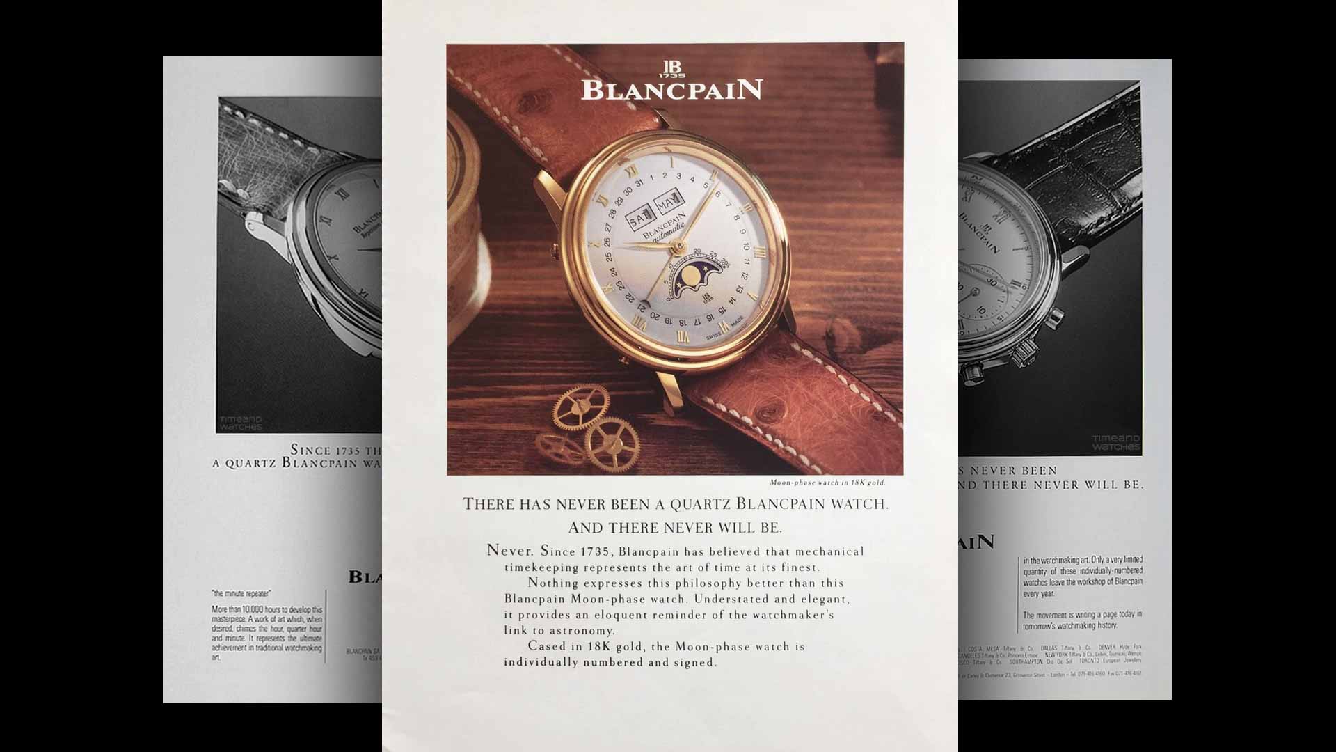 หลังจากนั้นทางแบรนด์จึงได้ประกาศสโลแกนที่ว่า “Since 1735 There Has Never Been A Quartz Blancpain Watch. And There Never Will Be.” โดยมีความหมายว่า นับตั้งแต่ปี ค.ศ. 1735 Blancpain ไม่เคยผลิตนาฬิกาควอตซ์ และจะไม่มีวันผลิตมันอย่างแน่นอน