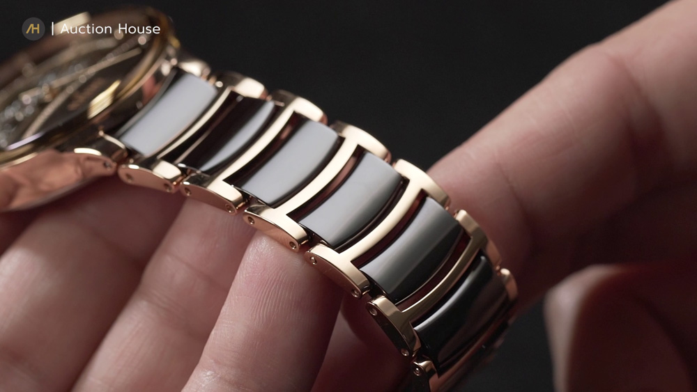 ส่วนสายเป็นแบบทูโทน ใช้สเตนเลสสตีลเคลือบ PVD สีโรสโกลด์แบบขัดเงา ผสานเข้ากับข้อต่อกลางที่ทำจากไฮเทคเซรามิกสีน้ำตาล ทำให้โทนสีทั้งหมดดูเข้ากันได้อย่างสมบูรณ์แบบ หน้าปัดประดับด้วยเพชร 12 เม็ด ซึ่งทางแบรนด์ได้คัดสรรและจัดเรียงเพชรได้อย่างประณีตสวยงาม