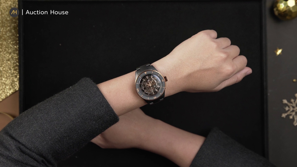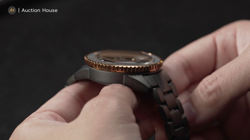 สำหรับขอบหน้าปัดเป็นแบบหมุนได้ทิศทางเดียวก็ทำจากวัสดุไฮเทคเซรามิกเช่นกัน แต่มีการเก็บงานที่แตกต่างด้วยการยิงเลเซอร์ ทำให้มีมิติที่โดดเด่นแต่ก็เข้ากันได้อย่างลงตัวเมื่อรวมกับตัวเลขอารบิกและขอบ Rose Gold อีกทั้งหน้าปัดแบบ Skeleton ที่เผยให้เห็นกลไกภายในที่ได้รับการขัดแต่งอย่างประณีต ซึ่งช่วยเพิ่มความสวยงามและความซับซ้อนให้นาฬิกาเรือนนี้ด้วย