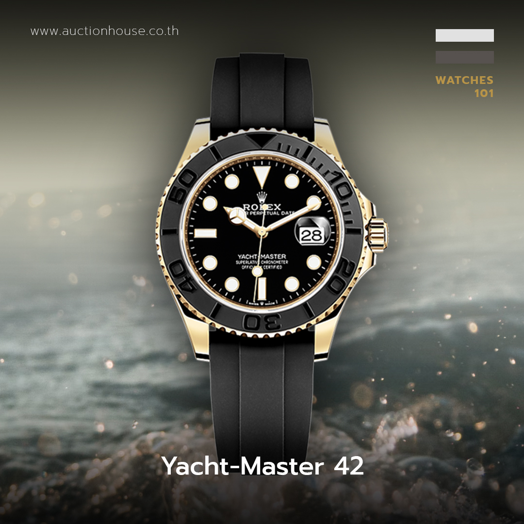 Yacht-Master เป็นนาฬิกาที่ได้รับการออกแบบพิเศษสำหรับนักเดินเรือและกัปตันเรือ โดย Yacht-Master 42 เวอร์ชันใหม่ โดดเด่นด้วยหน้าปัดที่ทำจากทองคำ 18 กะรัตเป็นครั้งแรก ซึ่งผ่านการรังสรรค์และหล่อขึ้นรูปที่เตาหลอมของ Rolex เป็นอย่างดี ทำให้นาฬิกามีความทนทานที่เหนือกว่า ขอบหน้าปัด Cerachrom หมุนได้สองทิศทางพร้อมขั้นบอกเวลา 60 นาทีสีดำด้านทำจากเซรามิก โดยตัวเลขและสัญลักษณ์เป็นตัวนูนที่มีการขัดเงาอย่างสวยงาม เข็มแสดงเวลาขนาดกว้างและมาร์คเกอร์ชั่วโมงในรูปทรงที่เรียบง่าย ไม่ว่าจะเป็น สามเหลี่ยม วงกลม หรือสี่เหลี่ยม เคลือบด้วยสารเรืองแสง Chromalight ที่ปล่อยแสงสีฟ้าสว่างติดต่อกันเป็นเวลานาน