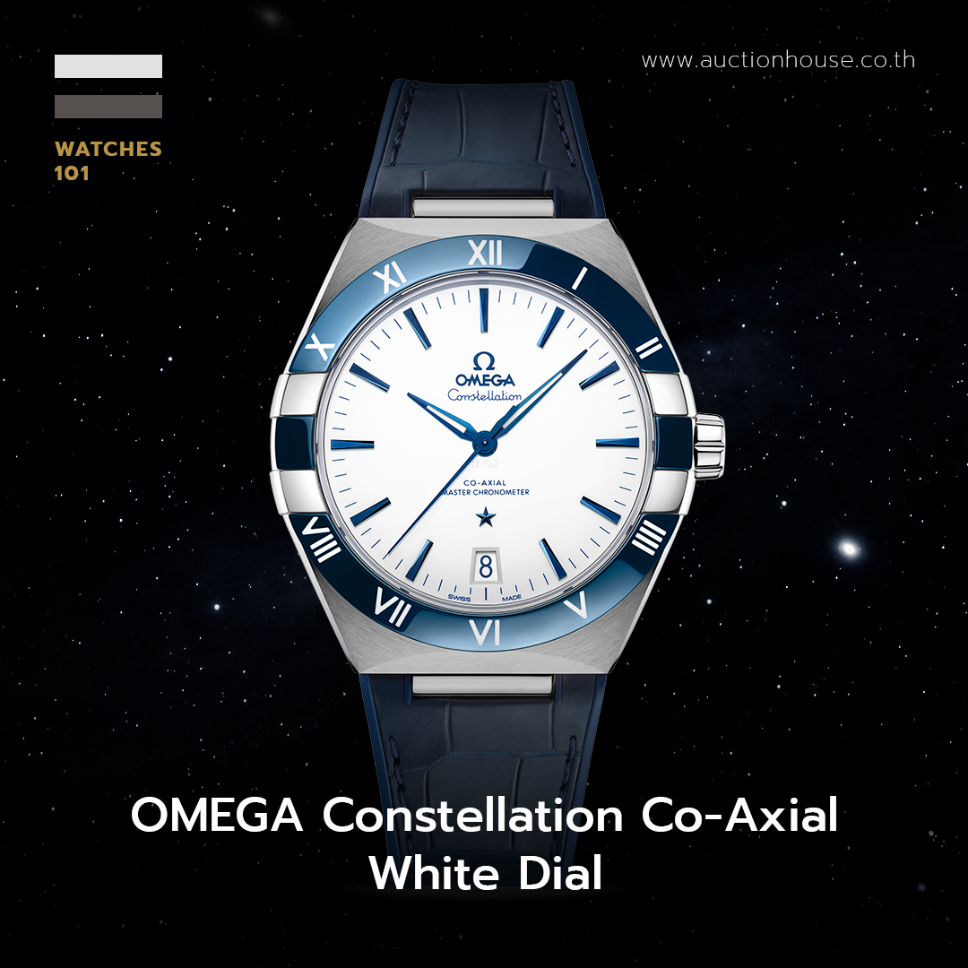 มาเริ่มกันที่ Constellation Co-Axial Master Chronometer 41mm Ref. 131.33.41.21.04.001 ตัวเรือนสเตนเลสสตีล โดดเด่นด้วยหน้าปัดทรงกลมสีขาว แต่งแต้มสีน้ำเงินบริเวณขอบหน้าปัด ชุดเข็ม และหลักชั่วโมง ส่วนบริเวณที่เหลือจะเป็นสีขาวที่ตัดกับสีฟ้าได้อย่างลงตัวและสวยงาม มีการเก็บรายละเอียดบริเวณขอบหน้าปัดด้วยการขัดเงาที่ทำให้ดูใหม่เอี่ยมอยู่ตลอดเวลา เสริมด้วยหน้าต่างวันที่บริเวณ 6 นาฬิกาที่ดูกลมกลืนเข้ากับพื้นหน้าปัดได้เป็นอย่างดี จับคู่มากับสายหนังสีน้ำเงินบุยางด้านใน พร้อมสลักโลโก้ OMEGA ไว้ด้วย ส่วนด้านหลังตัวเรือนเผยให้เห็นการทำงานของกลไกไขลานอัตโนมัติที่ได้รับการรับรองมาตรฐานความแม่นยำ Master Chronometer Certified สามารถต้านทานสนามแม่เหล็กได้ และกันน้ำลึกได้ที่ระดับ 50 เมตร ส่วนราคาจะอยู่ที่ 235,000 บาท