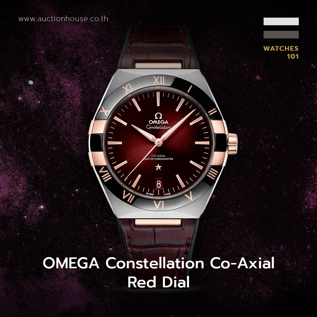 Constellation Co-Axial Master Chronometer 41mm Ref. 131.23.41.21.11.001 ตัวเรือนสเตนเลสสตีลผสานทอง Sedna™ โดดเด่นด้วยหน้าปัดทรงกลมสีแดงเบอร์กันดีไล่ระดับสีพร้อมขัดแต่งแบบ Sun-Brushed ที่ทำให้หน้าปัดดูมันวาวและมีมิติอย่างสวยงาม ประดับด้วยชุดเข็ม หลักชั่วโมง และขอบหน้าปัดที่แต่งแต้มสีออกชมพูซึ่งเป็นสีของทอง Sedna™ ตัดกับสีดำของพื้นขอบหน้าปัดได้อย่างลงตัว มีหน้าต่างวันที่อยู่บริเวณ 6 นาฬิกา และด้านบนมีดาวที่ทำจากทอง 18K Sedna™ เหมือนกับเม็ดมะยมที่ทำจากวัสดุเดียวกัน จับคู่มากับสายหนังสีแดงเบอร์กันดีบุยางด้านใน พร้อมสลักโลโก้ OMEGA ไว้ด้วย ส่วนด้านหลังตัวเรือนเผยให้เห็นการทำงานของกลไกไขลานอัตโนมัติที่ได้รับการรับรองมาตรฐานความแม่นยำ Master Chronometer Certified สามารถต้านทานสนามแม่เหล็กได้ และกันน้ำลึกได้ที่ระดับ 50 เมตร ส่วนราคาจะอยู่ที่ 325,000 บาท