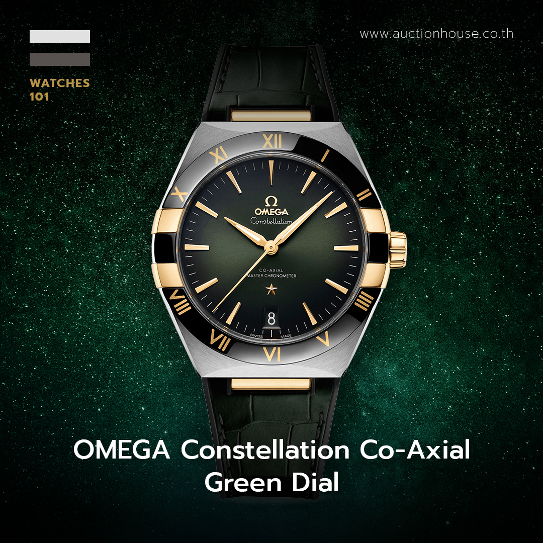 Constellation Co-Axial Master Chronometer 41mm Ref. 131.23.41.21.10.001 ตัวเรือนสเตนเลสสตีลผสานกับ Yellow Gold โดดเด่นด้วยหน้าปัดทรงกลมสีเขียวไล่ระดับสีพร้อมขัดแต่งแบบ Sun-Brushed ที่ทำให้หน้าปัดดูมันวาวและมีมิติอย่างสวยงาม ประดับด้วยชุดเข็ม หลักชั่วโมง และขอบหน้าปัดที่แต่งแต้มสีเหลืองซึ่งเป็นสีของ Yellow Gold 18K ตัดกับสีดำของพื้นขอบหน้าปัดได้อย่างลงตัว มีหน้าต่างวันที่อยู่บริเวณ 6 นาฬิกา และด้านบนมีดาวที่ทำจาก Yellow Gold 18K เหมือนกับเม็ดมะยมที่ทำจากวัสดุเดียวกัน จับคู่มากับสายหนังสีเขียวบุยางด้านใน พร้อมสลักโลโก้ OMEGA ไว้ด้วย ส่วนด้านหลังตัวเรือนเผยให้เห็นการทำงานของกลไกไขลานอัตโนมัติที่ได้รับการรับรองมาตรฐานความแม่นยำ Master Chronometer Certified สามารถต้านทานสนามแม่เหล็กได้ และกันน้ำลึกได้ที่ระดับ 50 เมตร ส่วนราคาจะอยู่ที่ 325,000 บาท