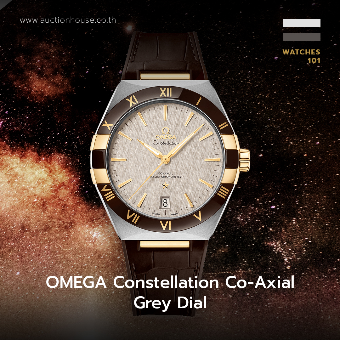 ปิดท้ายด้วย Constellation Co-Axial Master Chronometer 41mm Ref. 131.23.41.21.06.002 ตัวเรือนสเตนเลสสตีลผสานกับ Yellow Gold โดดเด่นด้วยหน้าปัดทรงกลมสีเทาอ่อนพร้อมตกแต่งเป็นเหมือนลวดลายผ้าไหม ซึ่งทาง Omega เรียกว่า Silk-embossed Dial ทำให้หน้าปัดดูมีดีเทลและมีมิติอย่างสวยงาม ประดับด้วยชุดเข็ม หลักชั่วโมง และขอบหน้าปัดที่แต่งแต้มสีเหลืองซึ่งเป็นสีของ Yellow gold 18K ตัดกับสีน้ำตาลของพื้นขอบหน้าปัดได้อย่างลงตัว มีหน้าต่างวันที่อยู่บริเวณ 6 นาฬิกา และด้านบนมีดาวที่ทำจาก Yellow gold 18K เหมือนกับเม็ดมะยมที่ทำจากวัสดุเดียวกัน จับคู่มากับสายหนังสีน้ำตาลบุยางด้านใน พร้อมสลักโลโก้ OMEGA ไว้ด้วย ส่วนด้านหลังตัวเรือนเผยให้เห็นการทำงานของกลไกไขลานอัตโนมัติที่ได้รับการรับรองมาตรฐานความแม่นยำ Master Chronometer Certified สามารถต้านทานสนามแม่เหล็กได้ และกันน้ำลึกได้ที่ระดับ 50 เมตร ส่วนราคาจะอยู่ที่ 325,000 บาท