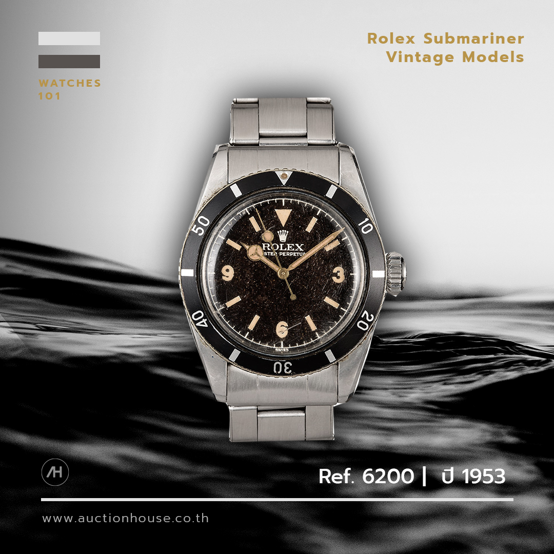 เริ่นต้นคอลเล็กชั่น Submariner โมเดล 6200 ที่ถูกผลิตขึ้นมาเป็นรุ่นแรกเพื่อทดลองและเปิดทางให้น้องๆ Submariner มาตั้งแต่ปี 1953 แต่ถึงอย่างนั้นก็ยังไม่ถูกจับใส่ในคอลเล็กชั่น Submariner จนกระทั่งในปี 1954 ภายหลังการออกวางขายรุ่น 6204 บริษัท Rolex จึงได้เพิ่มตัว 6200 เข้ามาในคอลเล็กชั่น Submariner ด้วย Submariner 6200 ถูกประมาณคร่าว ๆ กันว่าผลิตออกมาในยุคนั้นเพียงแค่ 300 เรือนเพื่อมาเป็นตัวอย่างในการหาดีไซน์หน้าปัด และการวางตำแหน่งข้อความบนหน้าปัด มีตีตรา Serial Number ตั้งแต่เลข 319xx ถึง 32xxx สักษณะเด่นสำคัญของ Submariner 6200 คือเม็ดมะยมอันใหญ่ขนาด 8 มิลลิเมตรจนได้ฉายาว่า “Big Crown Submariner” และยังใช้ตัวเลขบอกเวลาในตำแหน่ง 3 นาฬิกา 6 นาฬิกา และ 9 นาฬิกา ตำแหน่ง 12 นาฬิกาถูกแทนที่ด้วยสัญลักษณ์สามเหลี่ยมหัวกลับ และตำแหน่งเวลาอื่นๆ เป็นแท่งสี่เหลี่ยม ที่ต้องบอกว่าตัวเลข 3,6,9 นี้สำคัญนักเป็นเพราะว่า คุณจะไม่ได้เห็นการใช้ตัวเลขอารบิกแบบนี้บนหน้าปัด Submariner โมเดลอื่นๆ แน่นอน ราคาก็อยู่ที่ประมาณ 3,000,000 - 6,000,000 บาท