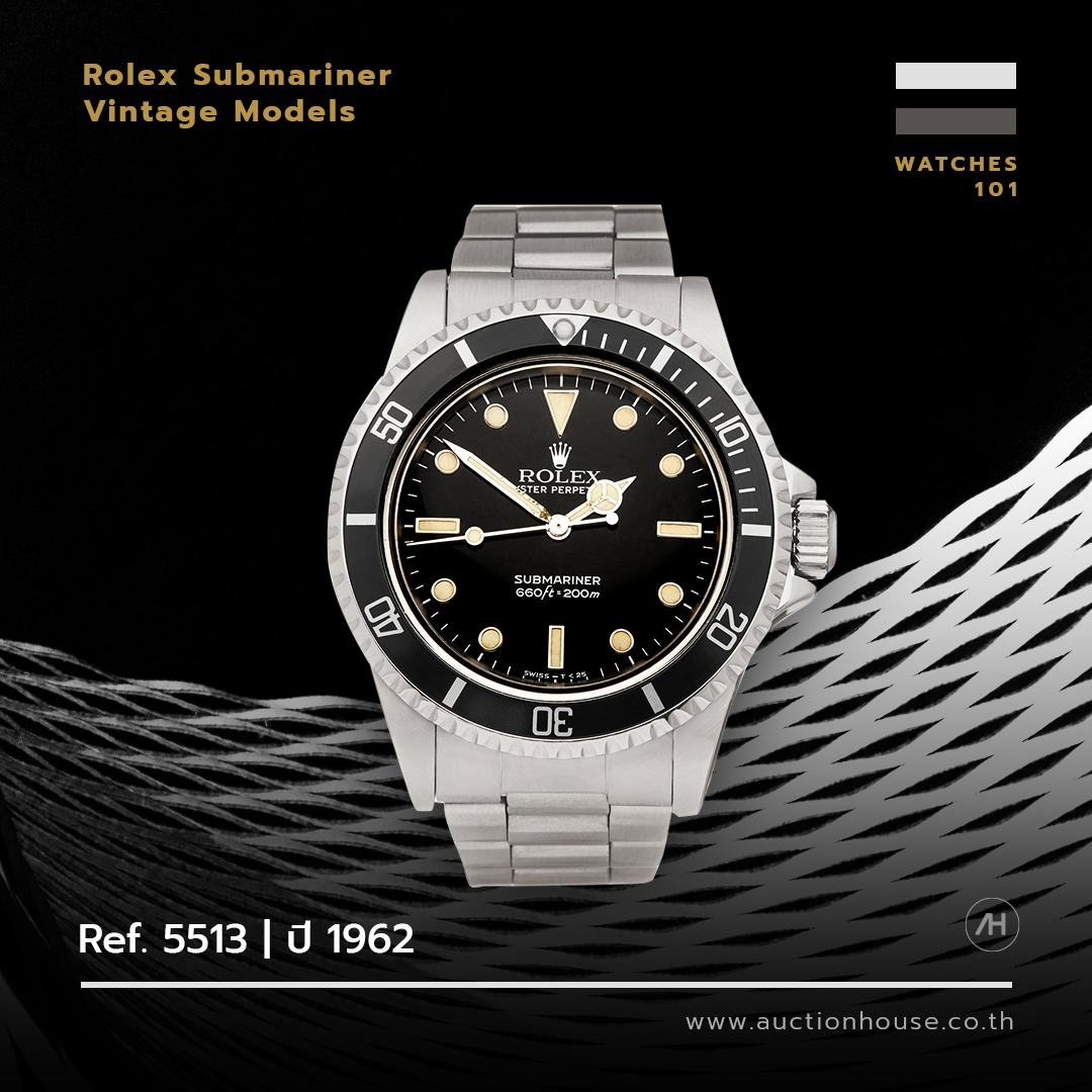 หลังจากรุ่น 6538 คอลเล็กชั่น Submariner ก็เปลี่ยนเลข Ref. มาใช้เลขขึ้นต้นเป็นเลข 5 แทน และออกวางขายในตลาดนาฬิกาเมื่อปี 1962 ถือว่าเป็นอีกหนึ่งรุ่นที่เซียนนาฬิกาอยากได้มาสะสมไว้ในคอลเล็กชั่นของตัวเอง ความแตกต่างของ 5513 คือการมี Crown Guard เข้ามาอยู่ด้านข้างเพื่อช่วยล็อกและป้องกันเม็ดมะยมจากการหมุนหรือการถูกกระแทก นอกจากนี้ก็ยังมีการปรับปรุงรูปลักษณ์ภายนอกอยู่เรื่อยๆ โดยเฉพาะการเปลี่ยนแบบหน้าปัด โดย 5513 ที่ถูกผลิตขึ้นแรกๆ จะเป็นหน้าปัดแบบ Gilt Gloss Dial จนกระทั่งในปี 1966 ได้เปลี่ยนแบบหน้าปัดมาเป็นแบบ Matte Dial และเป็นดีไซน์ที่ได้รับความนิยมมากที่สุดในบรรดานาฬิกา Submariner 5513 ราคาอยู่ที่ประมาณ 225,000 - 480,000 บาท