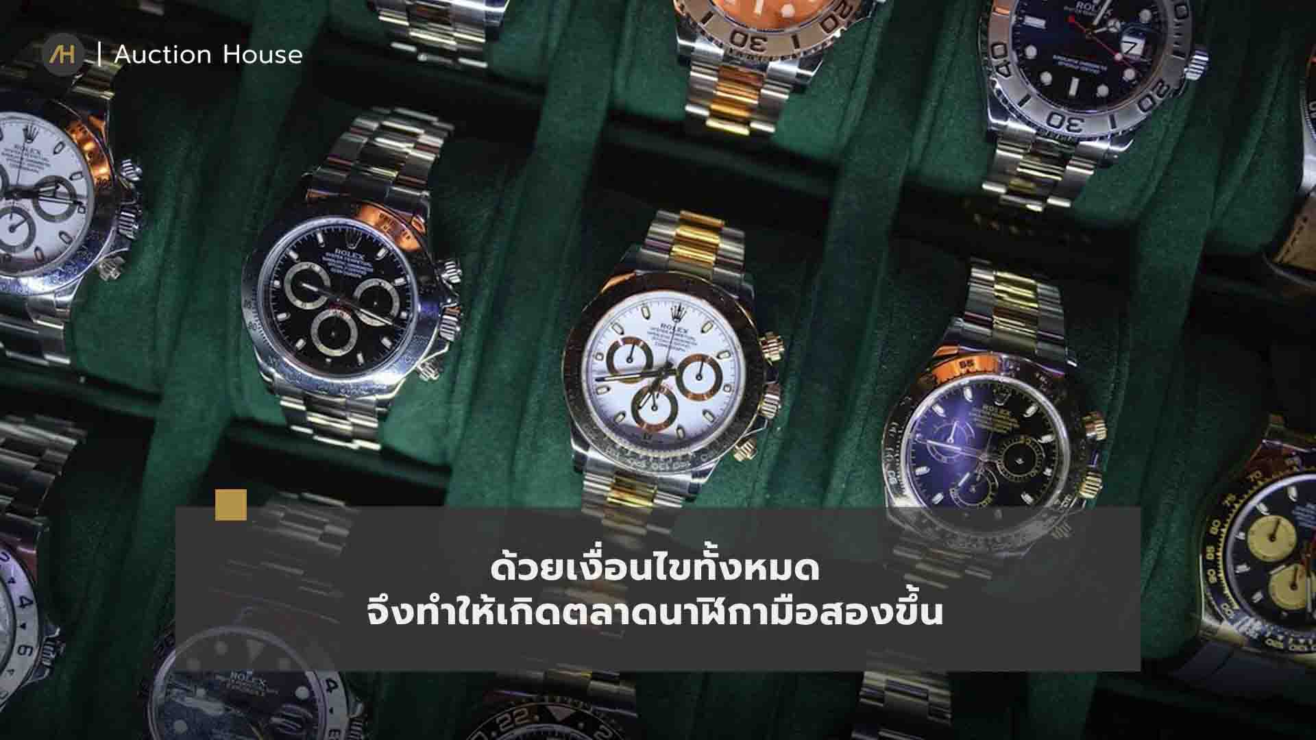 ด้วยเงื่อนไขเหล่านี้เองจึงทำให้เกิดตลาดนาฬิกามือสองขึ้นมา หรือที่คนในวงการเรียกกันว่าตลาด Resell โดยจะเห็นได้จากบุคคลที่นำนาฬิกาของตัวเองออกมาขายผ่านทางเว็บไซต์หรือกลุ่มซื้อขายต่าง ๆ หรือผู้ขายที่มีหน้าร้านนาฬิกาอยู่ที่ห้างสรรพสินค้า ซึ่ง Auction House ก็เป็นหนึ่งในช่องทางการซื้อ-ขายนาฬิกาหรูหลากหลายรุ่นและหลากหลายแบรนด์ โดยเราอำนวยความสะดวกทำหน้าที่เป็นตัวกลางให้ผู้ซื้อและผู้ขายทำการซื้อ-ขายกันบนเว็บไซต์ของเราได้อย่างง่ายดายและปลอดภัย หากใครสนใจนาฬิการุ่นไหนก็สามารถทักเข้ามาสอบถามข้อมูลกันก่อนได้ ผ่านช่องทางต่าง ๆ ของเรา