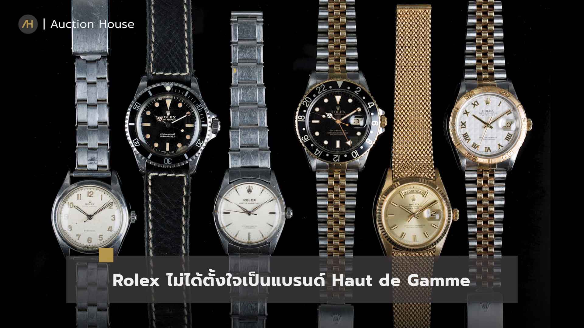 แต่ว่า Rolex นั้นไม่ได้ตั้งใจที่จะเป็นแบรนด์ “Haut De Gamme” มาตั้งแต่แรกอยู่แล้ว เพราะทางแบรนด์ตั้งใจผลิตสินค้าคุณภาพสูงที่เน้นไปในด้านความอึด คงทน และการใช้งานเป็นหลัก ไม่ได้มีการผลิตแบบ Grand Complication หรือมีการ Finishing ขั้นสูง ซึ่งเป็นงานคนละแนวทางกับ Big Three จึงทำให้ไม่ได้อยู่ในกลุ่มเดียวกัน