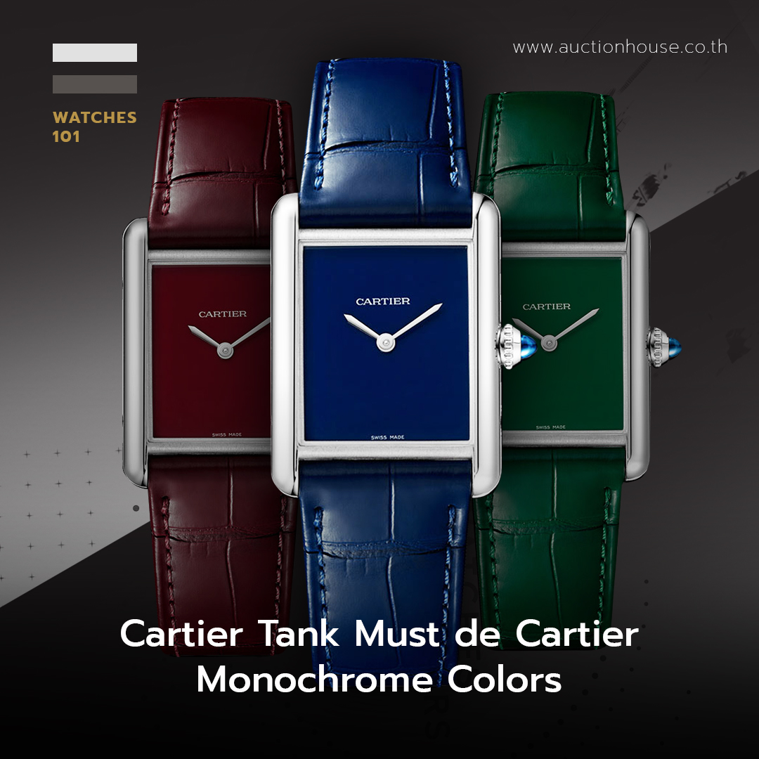 เริ่มต้นด้วย Cartier Tank Must de Cartier Monochrome Colors ที่ได้รับแรงบันดาลใจมาจากนาฬิกาสไตล์วินเทจรุ่นดั้งเดิมในปี 1970 คอลเลกชันใหม่นี้สีสันสดใส มีทั้งหมด 3 สีด้วยกัน คือ สีแดง น้ำเงิน เขียว คงความเป็นเอกลักษณ์ด้วยหน้าปัดทรงสี่เหลี่ยมผืนผ้าจับคู่กับสายหนังจระเข้ที่เข้ากันเป็นอย่างมาก ตัวเรือนสเตนเลสสตีลโดดเด่นด้วยชุดเม็ดมะยมพร้อมพลอยไพลินสังเคราะห์สีน้ำเงิน ขนาด 33.7 x 25.5 มิลลิเมตร กระจกแซฟไฟร์ กันรอยขีดข่วนได้เป็นอย่างดีทำงานด้วยระบบควอตซ์แบบโมโนโครม ราคา 85,540 บาท