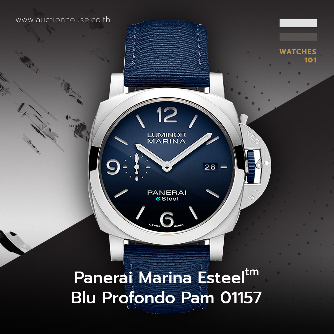 Panerai Marina Esteel Pam 01157 หน้าปัดสีน้ำเงินไล่ระดับสี ขนาด 44 มิลลิเมตร จับคู่กับสายสีน้ำเงินเข้ากันเป็นอย่างดี โดดเด่นด้วยวัสดุ Steel ที่นำมารีไซเคิลและผลิตออกมาอีกครั้งในชื่อว่า E-Steel ซึ่งบนหน้าปัดทุกรุ่นที่จะมีคำว่า Esteel ประทับอยู่ทุกเรือน เพื่อให้แตกต่างจากรุ่นธรรมดาและให้รู้ว่านาฬิการุ่นนี้ผลิตจาก E-Steel ทำงานด้วยกลไกไขลานอัตโนมัติ P.9010 และสำรองพลังงานได้สูงสุด 3 วัน ราคาประมาณ 280,000 บาท