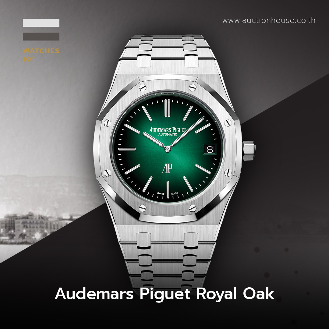 รุ่นต่อมาก็ยังคงคอนเซ็ปต์หน้าปัดสีเขียวที่ได้รับความนิยมเป็นอย่างมากในปีนี้ สังเกตได้จากหลายแบรนด์ที่เปิดตัวมาด้วยหน้าปัดโทนเขียวให้ทุกคนได้จับจองกัน และแบรนด์ AP ก็เป็นหนึ่งในนั้นที่ได้เปิดตัว Audemars Piguet Royal Oak Extra-Thin 950 Platinum Smoked Green Sunburst ที่มีความพิเศษอยู่ตรงหน้าปัดและวัสดุที่ใช้ในการผลิต โดดเด่นด้วยหน้าปัดสีเขียวรมควันที่ขัดแต่งด้วยเทคนิค Smoked Green Sunburst เพื่อให้ได้สีที่มีการไล่ระดับจากตรงกลางเขียวแผ่ออกไปยังขอบจะมีสีดำ โดยตัวเรือนมีขนาด 39 มิลลิเมตร ผลิตจาก Platinum 950 เช่นเดียวกับสายนาฬิกา ขัดแต่งลวดลายซาตินทั้งตัวเรือนและสาย เข็มนาฬิกาและหลักชั่วโมงแบบขีดทำจาก White gold มีหน้าต่างวันที่อยู่ที่ตำแหน่ง 3 นาฬิกา ขับเคลื่อนด้วยกลไก Selfwinding Calibre 2121 และสามารถสำรองพลังงานได้สูงสุด 40 ชั่วโมง ส่วนราคาอยู่ที่ 97,100 ฟรังก์สวิส หรือประมาณ 3,329,000 บาท
